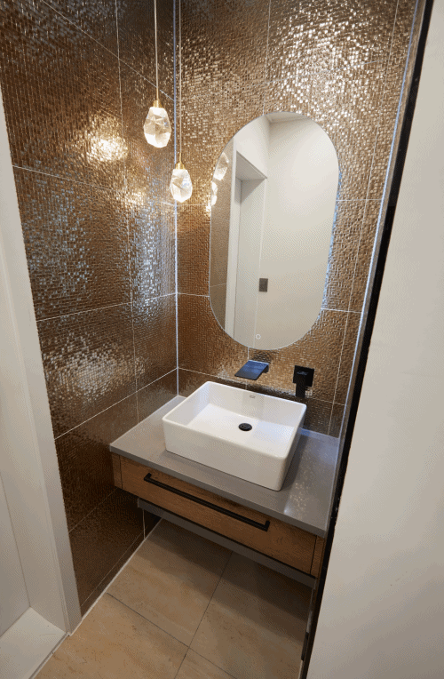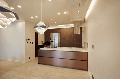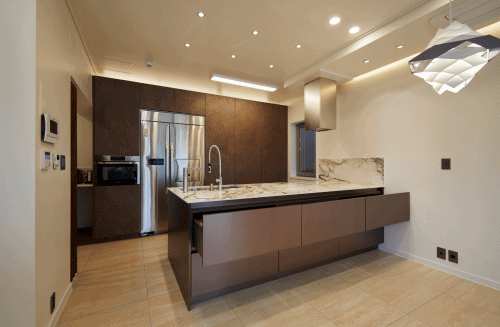 주방가구에는 두 가지의 재질을 사용하되, 두 개 재질이 연결되도록 사용하였다. 골드빛이 도는 브라운 컬러인 골드 브라운을 활용하면서 아일랜드 조리대는 플랫한 재질로, 뒤쪽 전면장은 약간의 거친 느낌을 느낄 수 있는 재질로 사용하여 재미 요소를 주었다.